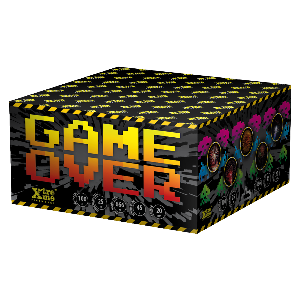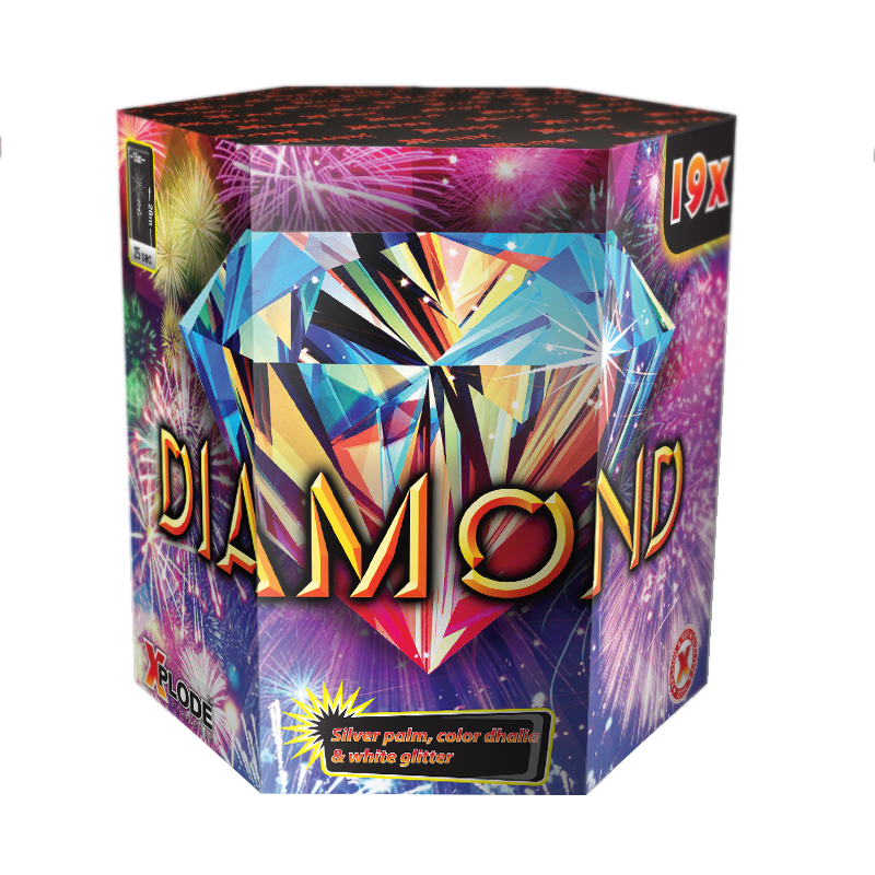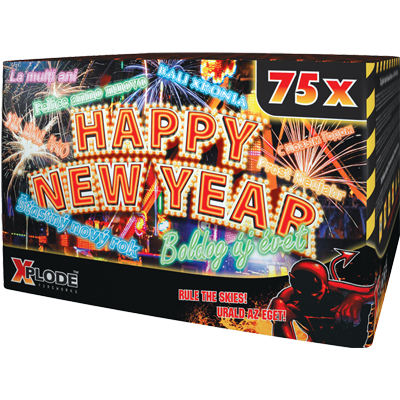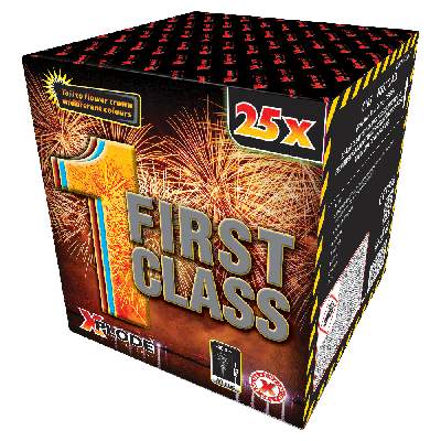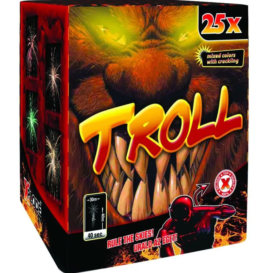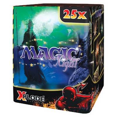 vegyes szépen válogatott töltetekkel rendelkező, színes, villogó, recsegő effektek egy 25 lövéses tűzijáték telepben.